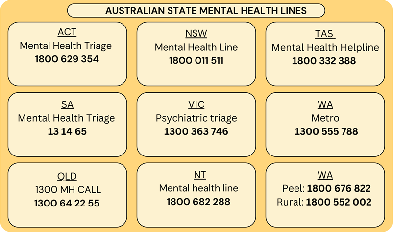 - Mental Health Access Line: free mental health telephone access across all states in Australia